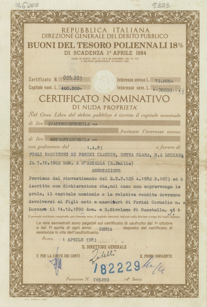 Repubbl. Ital. – BTP Poliennali 18% – di Scad. 1° Aprile 1984 Cert. Nomin. di Nuda Propr.