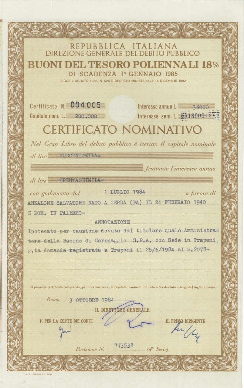Repubbl. Ital. – BTP Poliennali 18% – di Scad. 1° Gennaio 1985 Cert. Nomin.