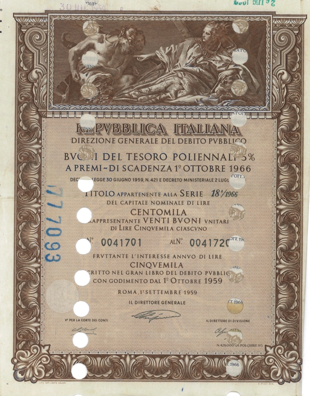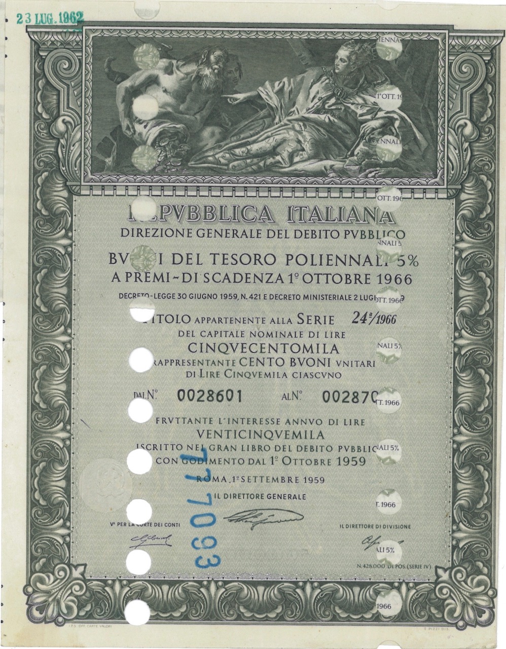 Repubbl. Ital. – BTP Poliennale 5% a Premi – di Scad. 1° Ottobre 1966 al Port.