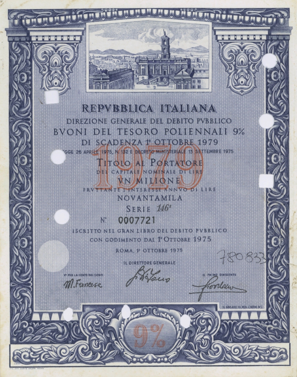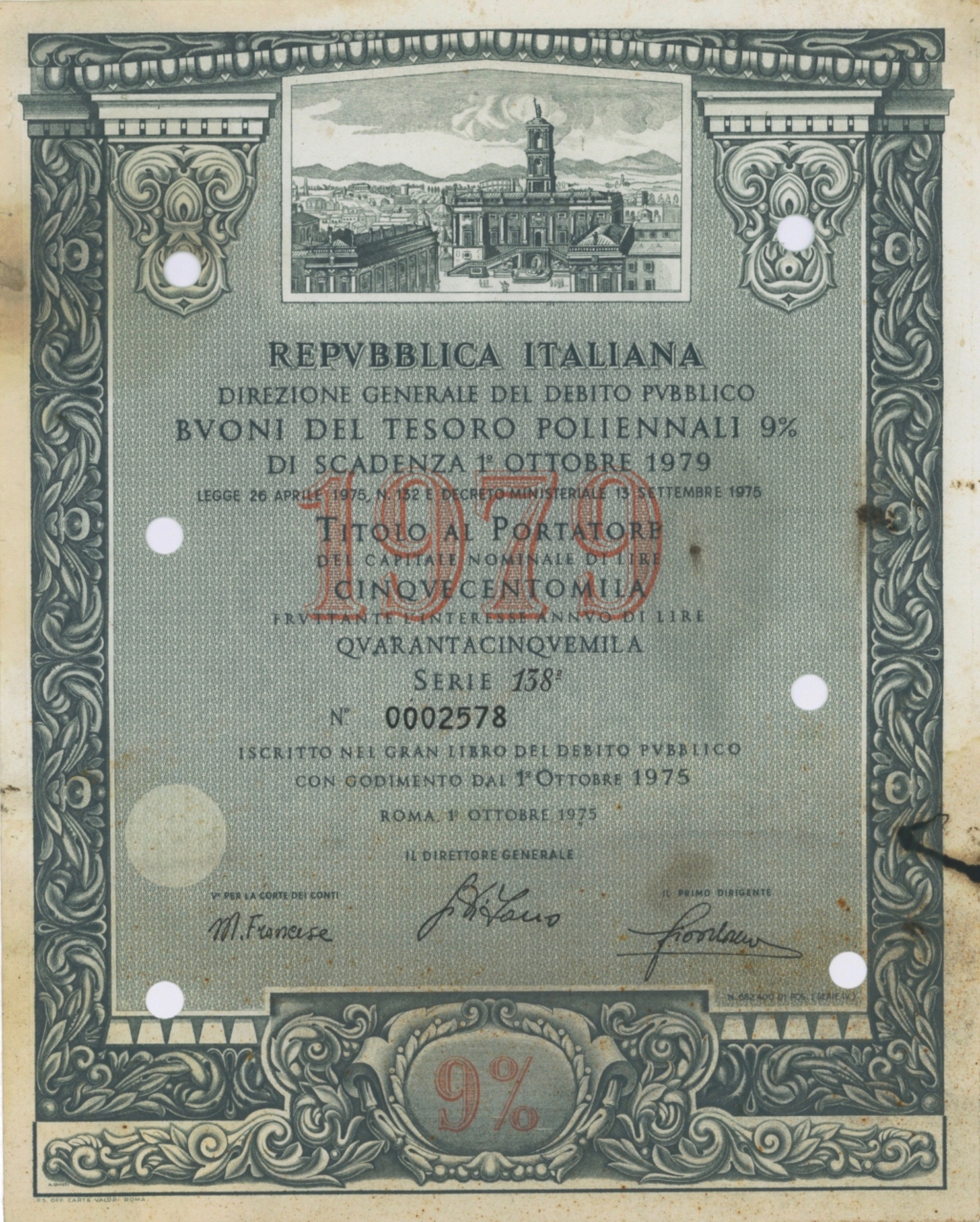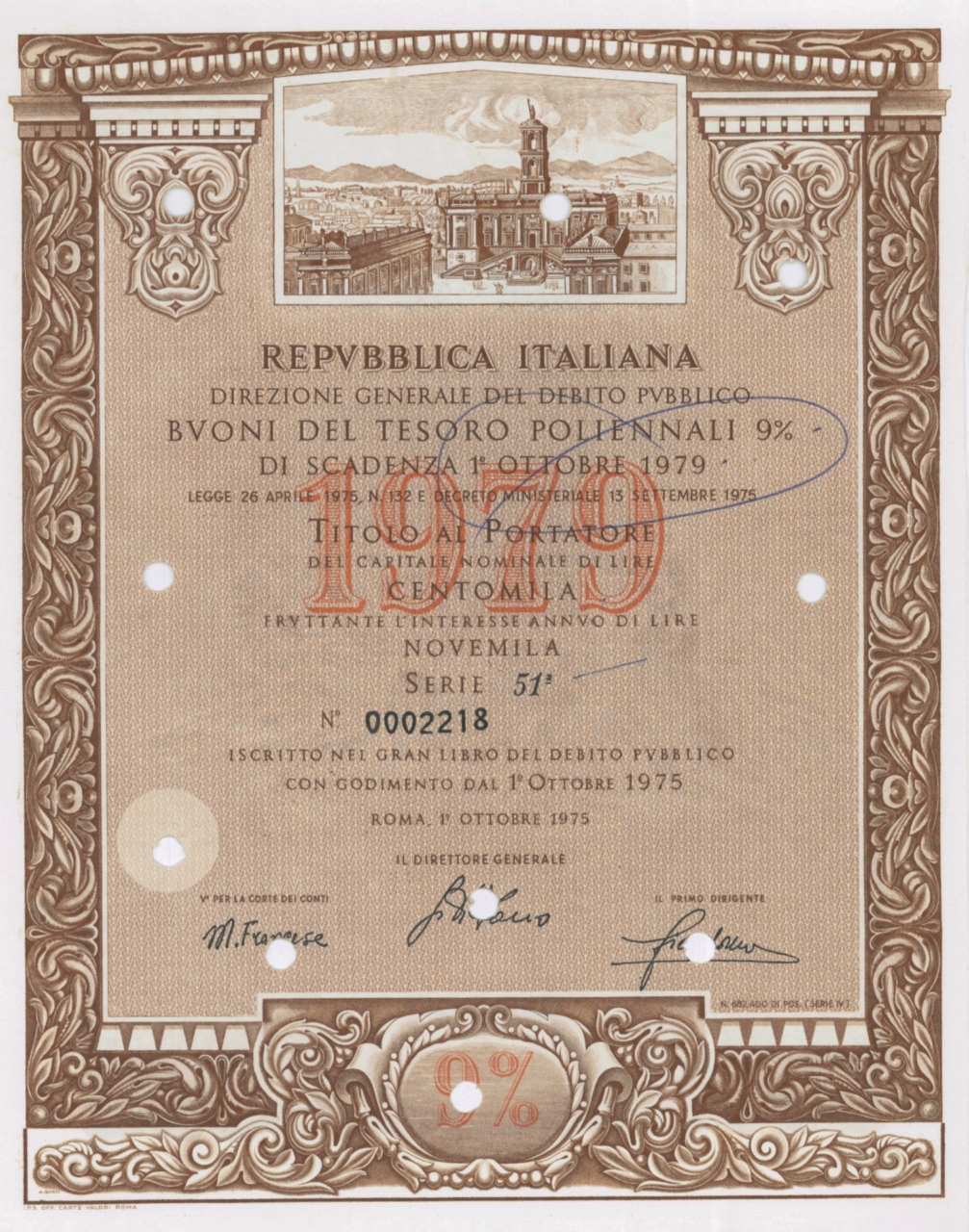 Repubbl. Ital. – BTP Poliennali 9% – di Scad. 1° Ottobre 1979 al Port.