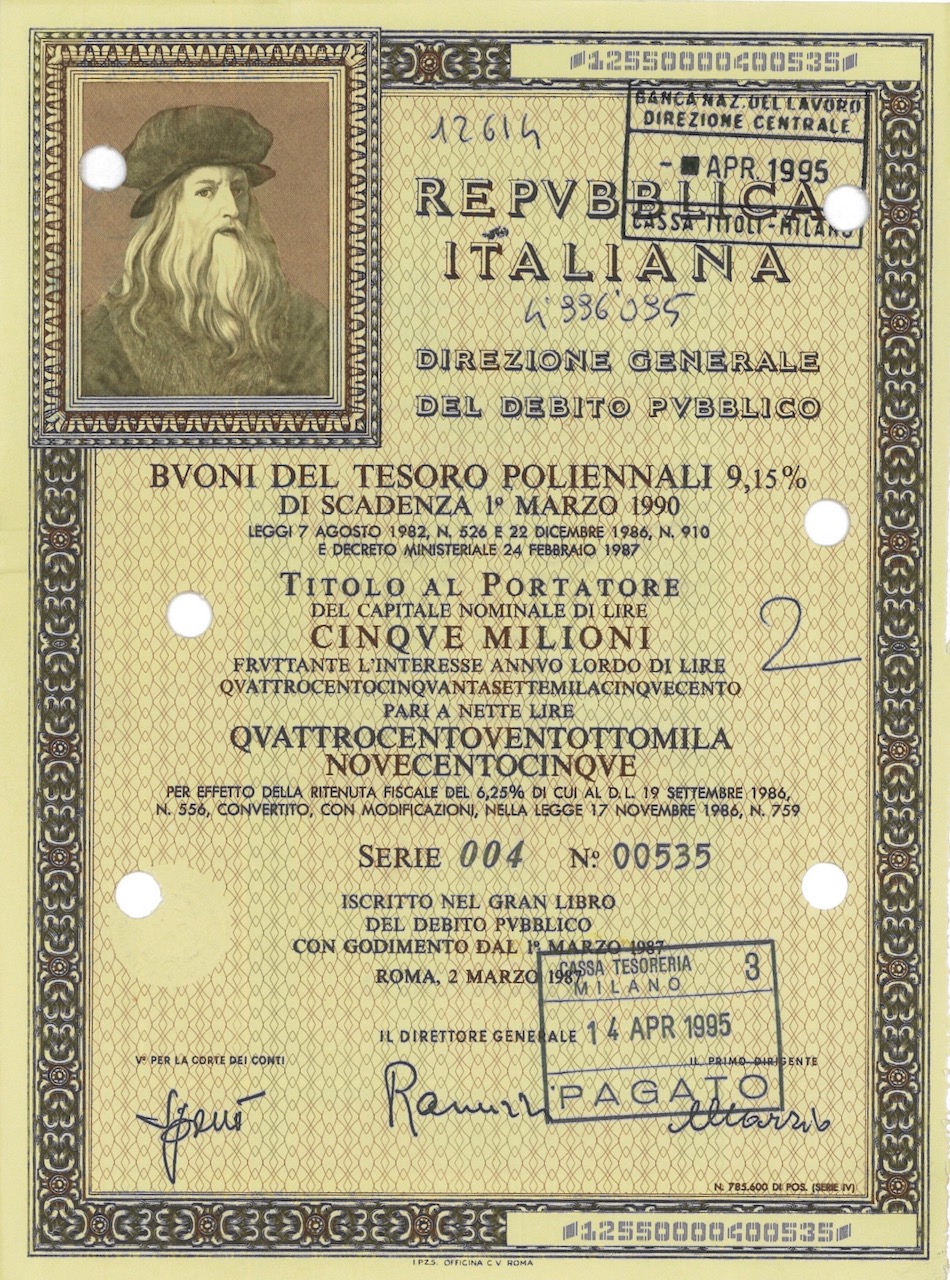 Repubbl. Ital. – BTP Poliennali 9,15% – di Scad. 1° Marzo 1990 al Port.