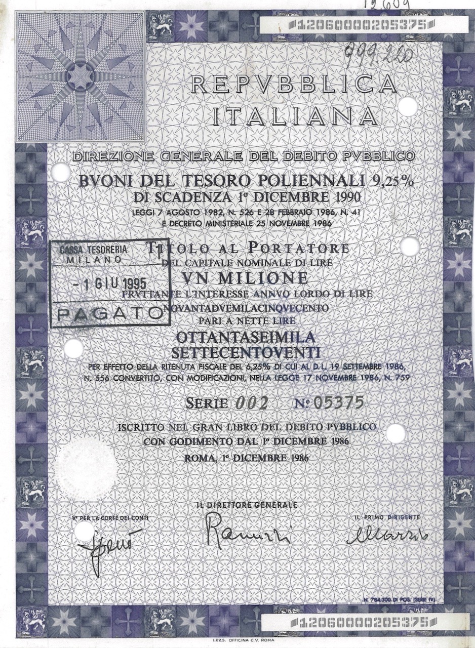 Repubbl. Ital. – BTP Poliennali 9,25% – di Scad. 1° Dicembre 1990 al Port.