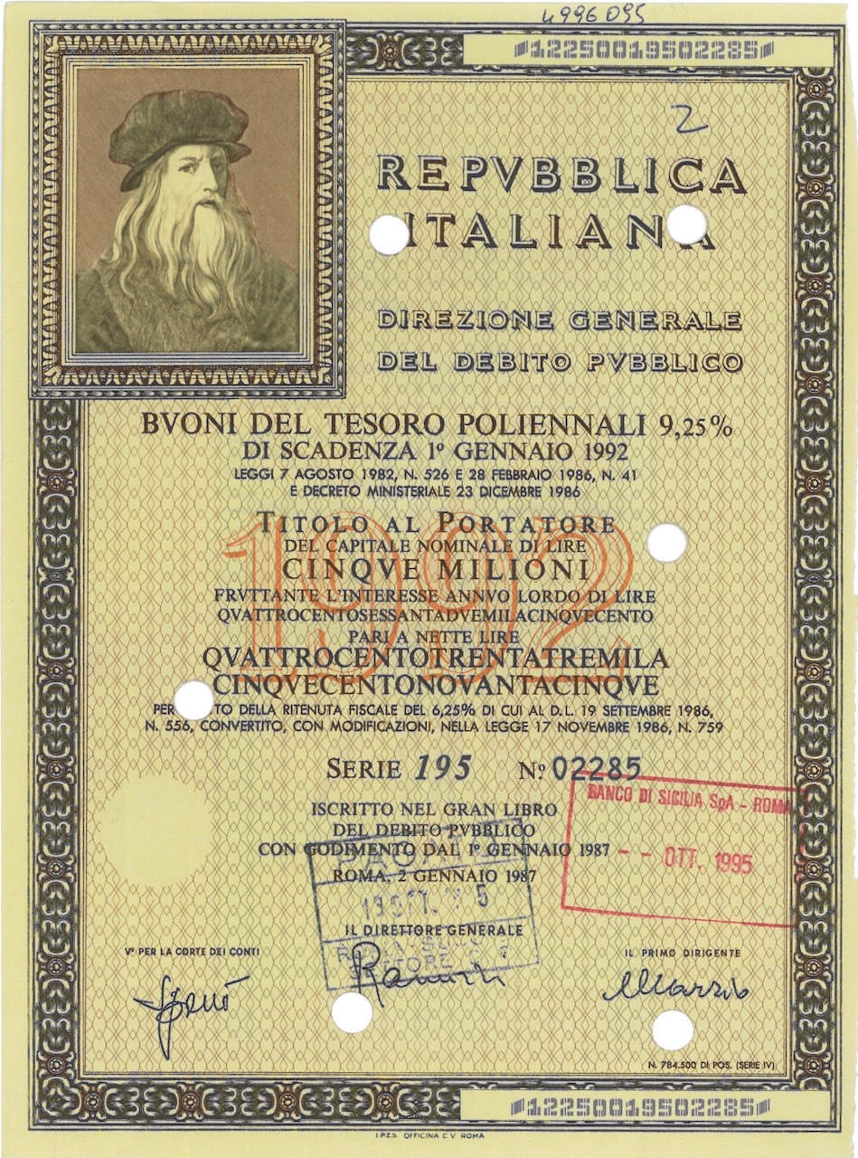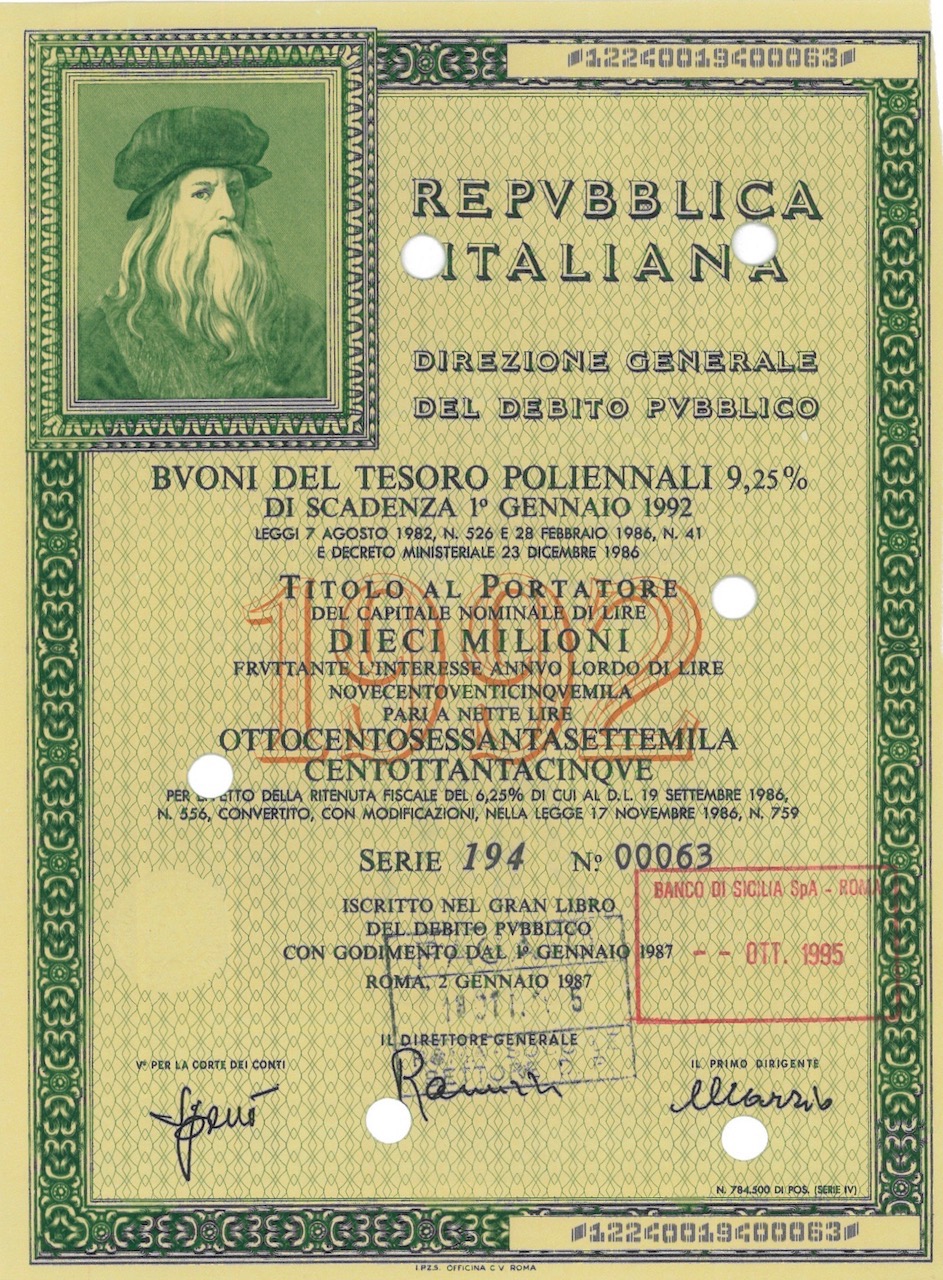 Repubbl. Ital. – BTP Poliennali 9,25% – di Scad. 1° Gennaio 1992 al Port.