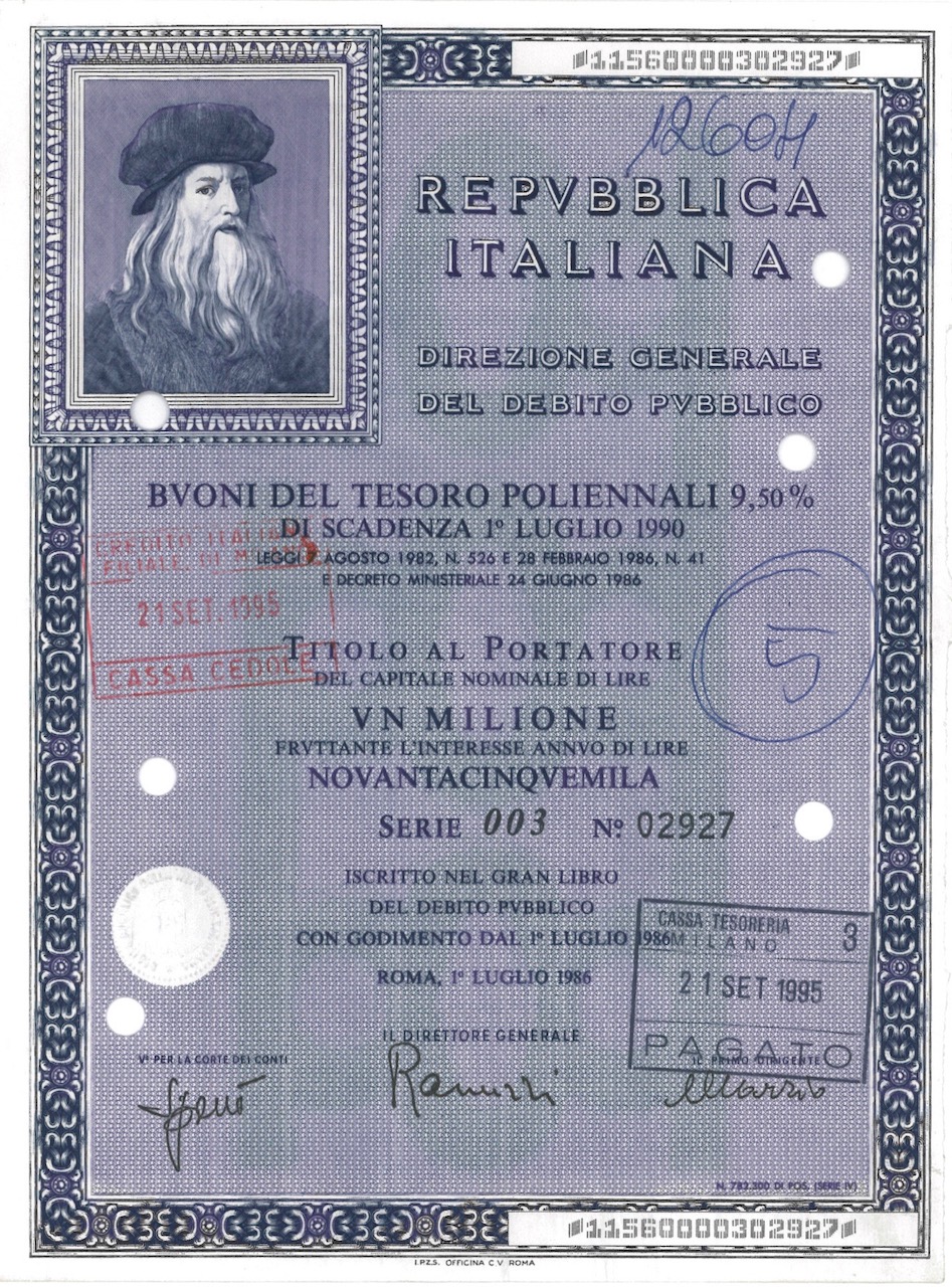 Repubbl. Ital. – BTP Poliennali 9,50% – di Scad. 1° Luglio 1990 al Port.