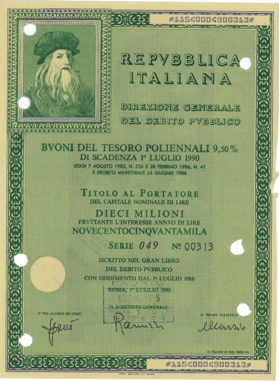 B-16464Repubbl. Ital. – BTP Poliennali 9,50% – di Scad. 1° Luglio 1990 al Port.-2Roma198610000000 di lireVerdeR3 (501-1000 pezzi)S3 (da 51 a 100 €)