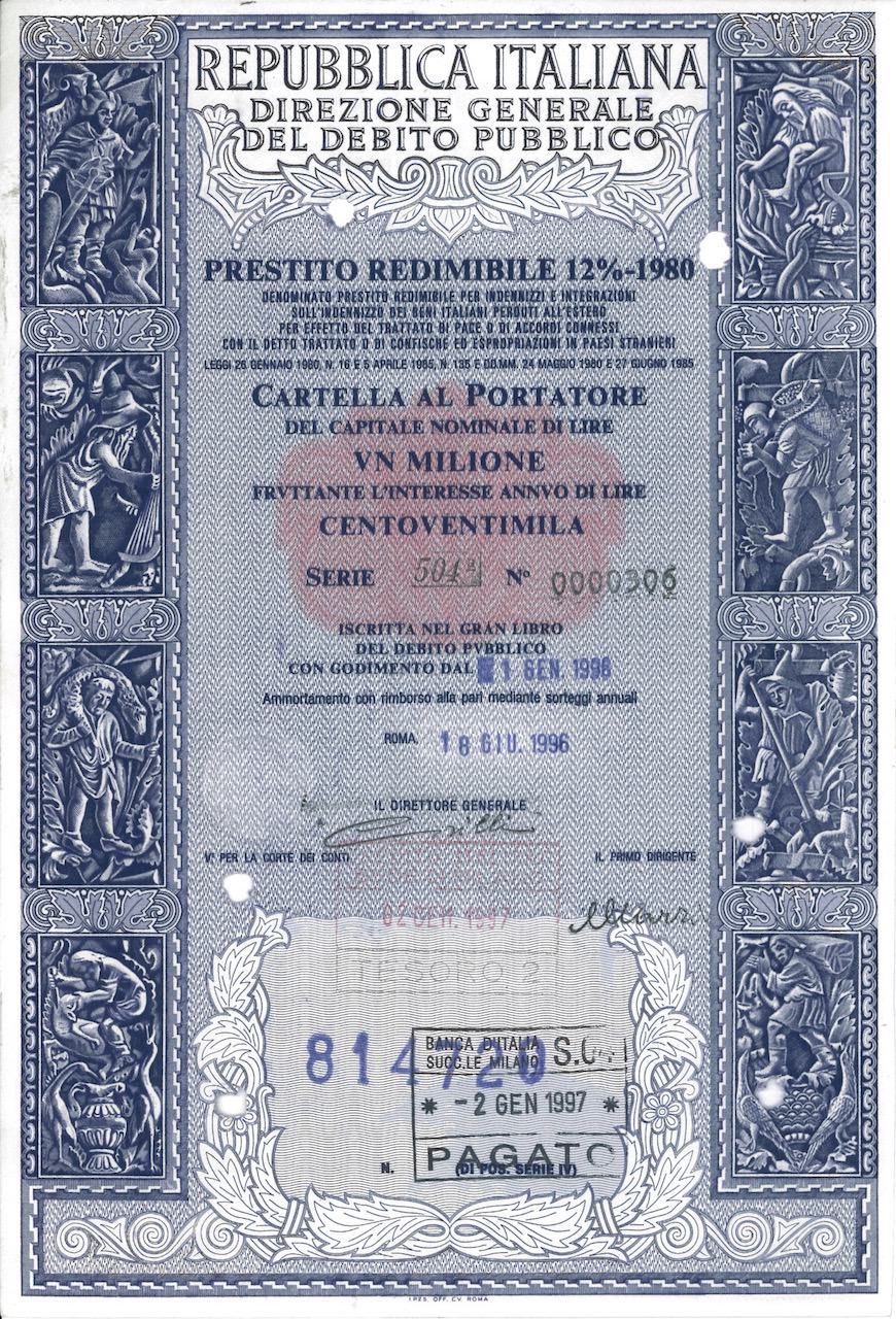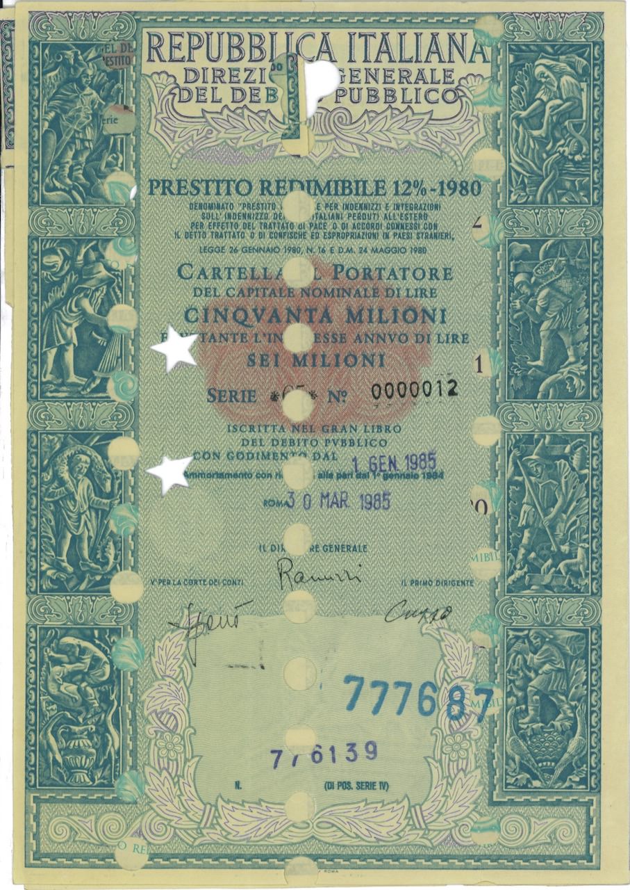 Repubbl. Italiana – Dir. Gen. del Deb. Pubbl. – Prest. Redim. 12% – 1980