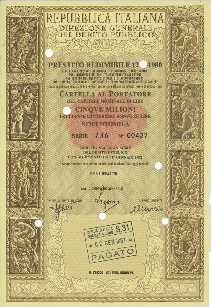 Nel 1971 con la ne degli accordi di Bretton Woods, l’emissione della moneta e del debito si trasformarono profondamente spianando la strada all’era attuale che ha portato inevitabilmente alla dematerializzazione facendo sparire dalla circolazione quei meravigliosi documenti cartacei che per anni furono il vanto dei loro emittenti, ma che tristemente furono mandati al macero rendendoli oggi, per fortuna nostra, rari e preziosi oggetti da collezione e da investimento.