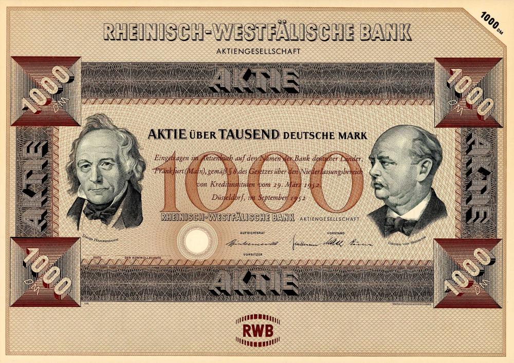 Istituto successivo della Deutsche Bank fondato nel 1870 dopo la distruzione degli Alleati. Gli Alleati inizialmente costituirono 10 banche successive più piccole nel 1947 nelle tre zone di occupazione occidentali, concentrate in tre società per azioni nel 1952: Norddeutsche Bank ad Amburgo, Rheinisch-Westfälische Bank AG a Düsseldorf, e Süddeutsche Bank AG a Monaco e Francoforte aM. In tal modo, le azioni di questi tre istituti successivi sono denominate in DM, nonché le nuove azioni di Altbank che sono ancora denominate in Reichsmark per la proprietà espropriata della zona orientale (i cosiddetti “rapporti residui”). Già nel 1957, gli alleati occidentali abbandonarono le loro idee disaggregate e i tre successori si fusero di nuovo per formare la “nuova” Deutsche Bank AG con sede legale a Francoforte a.M.