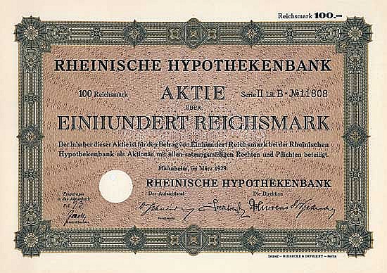 A-65377Rheinische Hypothekenbank-1Mannheim19291 azione da 100 MarchiR4 (251-500 pezzi)S4 (da 101 a 250 €)