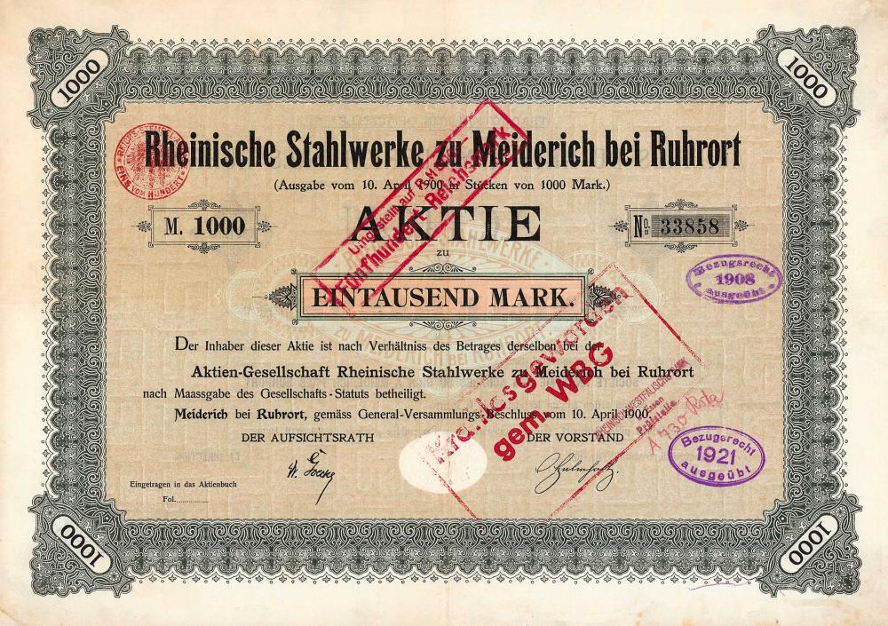 Fondata nel 1870 da azionisti tedeschi, belgi e francesi con 1 milione di capitale come “S.A. des Aciéries Rhénanes à Meiderich” con sede legale a Parigi. A Meiderich furono costruite una fonderia di acciaio Bessemer e una fabbrica di materiali refrattari. Trasferimento del 1872 a Meiderich, riorganizzazione del 1878 e riemissione completa delle azioni. Nel 1881 messa in servizio di un nuovo laminatoio ferroviario e acquisto della miniera di ferro di Lacheberg a Nassau. Nel 1882, insieme alla società Saarbrücken Gebr. Röchling, acquisto di ampie concessioni Minette in Lorena. Nel 1886 partecipazione a acciaierie nella Russia meridionale, finalmente nel 1889 costruzione del primo altoforno. Nel 1900 con l’acquisizione della “Union Centrum” creazione della propria base di carbone, in seguito acquisizione di ulteriori grandi miniere. Nel 1904 acquisizione della “Duisburger Eisen- und Stahlwerke”, fusione del 1922 con la tradizionale Arenberg’schen AG per miniere e fonderie, fondata nel 1856. Nel 1926, le fonderie e le acciaierie e le miniere di minerali vennero portate nella Vereinigte Stahlwerke AG, ma non nelle miniere di carbone, che vennero spinte nella Arenberg Bergbau-GmbH nel 1952 come parte delle misure di separazione degli Alleati. Fino a quando non è stata recentemente incorporata nella Thyssen AG, la vecchia Rheinstahl, che fino a quel momento era ancora quotata in borsa, era recentemente conosciuta come Thyssen Industrie AG.