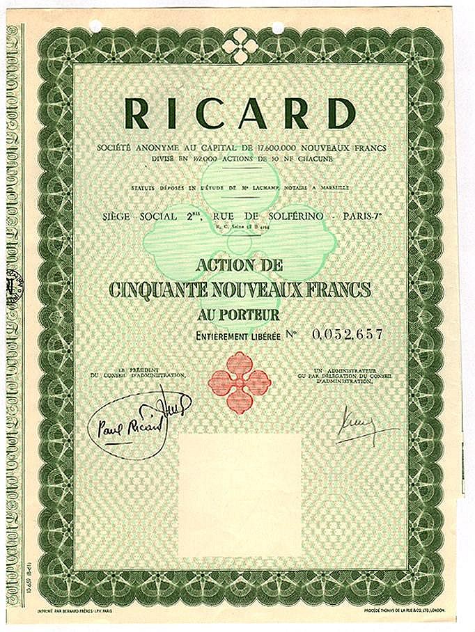 La celebre distilleria marsigliese porta il nome del Presidente Paul Ricard (firma sul certificato) che, nel 1932, creò l'aperitivo Pastis Ricard. Si tratta di un aperitivo alcolico profumato all’anice tipico di Marsiglia e di tutta la Provenza. Dal 1975 fa parte del terzo gruppo mondiale specializzato in vini e alcolici, la Pernod Ricard.