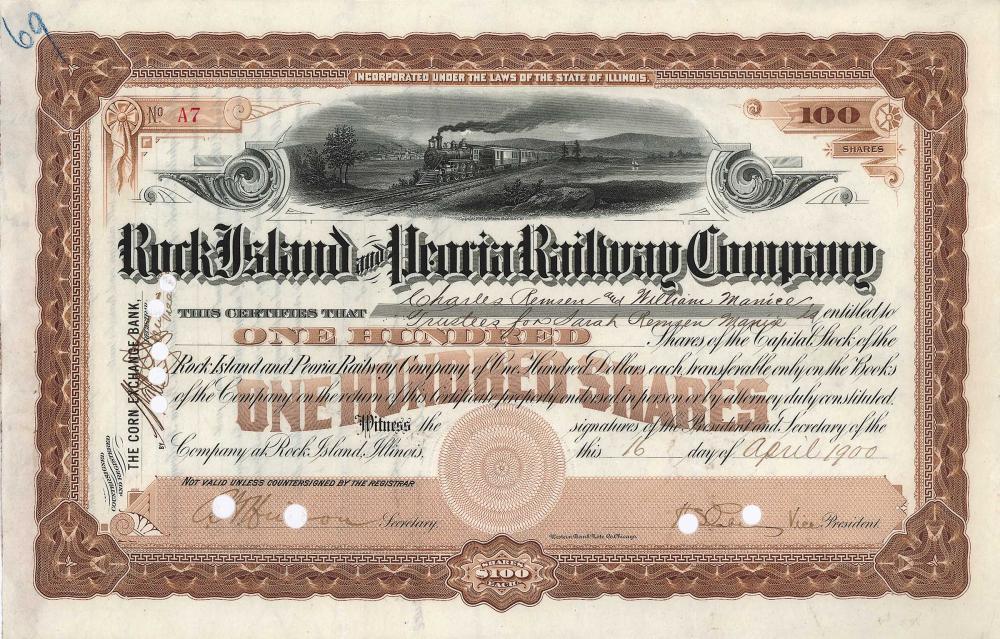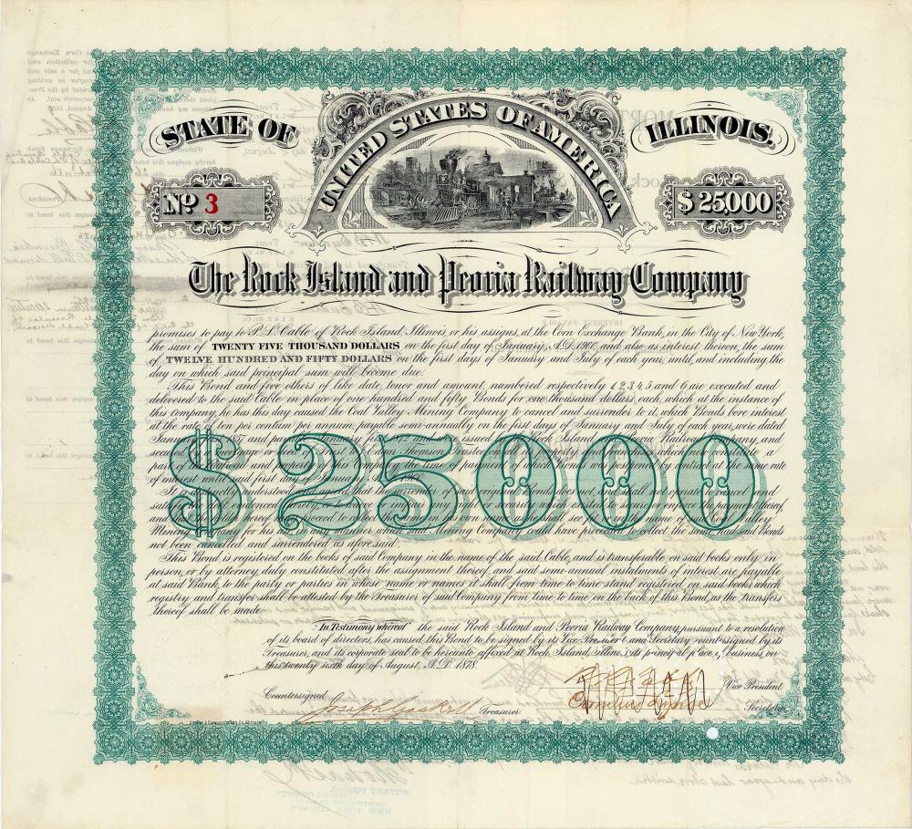 Fondata nel 1869 come RR dalla fusione di due predecessori, preclusa nel 1877 e riorganizzata come Ry. Itinerario Rock Island-Peoria, Illinois (91 miglia). Più tardi venne affittata a Chicago, Rock Island e Pacific RR.