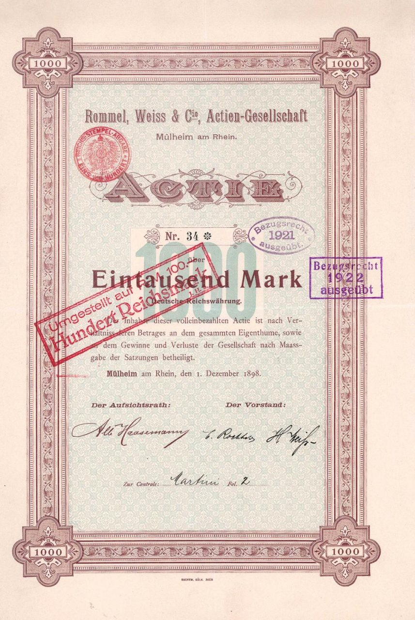 Fondata nel 1864, AG dal 1898. Funzionamento di una tessitura con 250 telai, 48 macchine di lavorazione e finitura e 80 macchine da cucire. Vele di tela, lino pesante, tessuti di iuta e cotone, tessuti filtranti e pressati, tessuti antivento, tele per vele impermeabili, noleggio e coperte per cavalli, gonne antipioggia, grembiuli, sacchi e tende di ogni tipo sono stati prodotti. Nel 1932 la fabbrica di Colonia-Mülheim (Holweider Str. 4 -8) chiuse ed entrò in liquidazione nel 1934.
