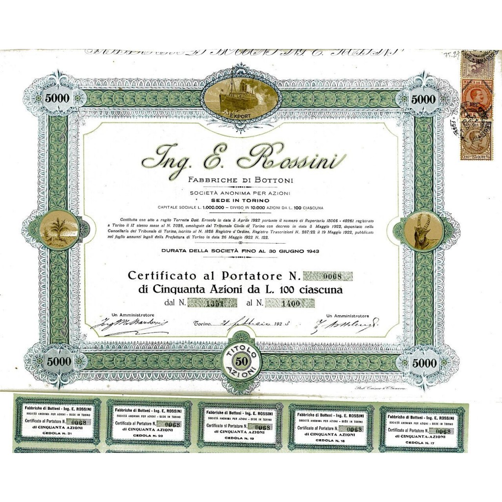 B-49292Rossini (Ing. E.) – Fabbrica Bottoni-2Torino192350 azioni di fondazione al portatore da Lire 100R3 (501-1000 pezzi)S3 (da 51 a 100 €)