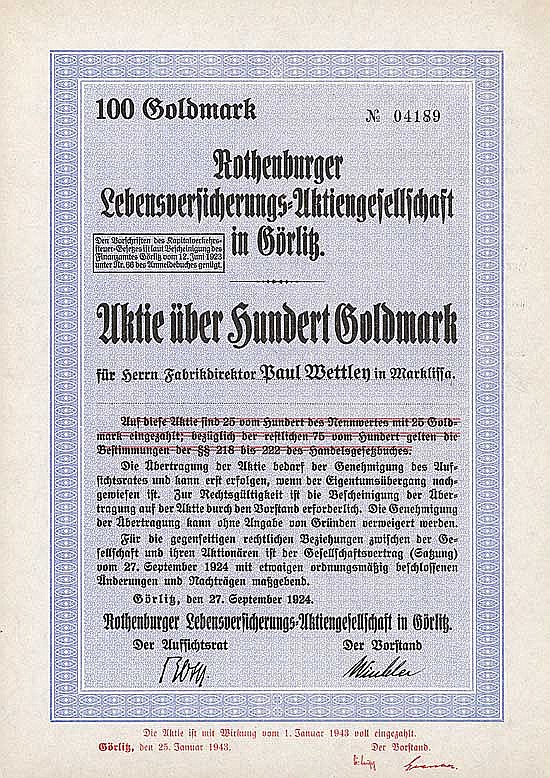 Fondata nel 1923 rilevando le partecipazioni della “Società di mutua assicurazione Rothenburger” fondata nel 1856. L’ultimo azionista di rilievo era la Cologne Re; la sede dell’azienda fu quindi trasferita a Colonia dopo il 1945 e il portafoglio assicurativo fu trasferito a Colonia Leben nel 1955.