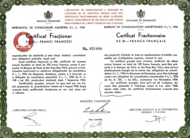 Royaume de roumanie – emprunt de consolidation amortissable 4,5% 1934