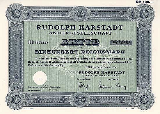 Rudolph Karstadt fondò la sua prima attività di stoffa, produzione e confezione a Wismar nel 1881. Dopo una rapida espansione (ora c’erano 35 negozi Karstadt nel nord della Germania), la Rudolph Karstadt AG fu fondata ad Amburgo nel 1920. Nello stesso anno, acquisizione della società di grandi magazzini Theodor Althoff a Münster (19 negozi nella Germania occidentale, risalenti a una merceria, un negozio di articoli bianchi e lana a Dülmen fino al 1885). Il forte desiderio di produzione interna è evidente nell’acquisizione simultanea della filatura e tessitura del cotone SA Weyl & Sohn e della tessitura colorata Gebr. Braunschweig (entrambe a Bocholt), della fabbrica di tendaggi Fränkel & Hering ad Auerbach e del grossista di carta Walter Klestadt a Essen, anch’essa rilevata nel 1925. Il progetto Engelhardt e la tintoria per lino si svolgevano a Kassel. Ulteriori investimenti in fabbriche di pellicce, profumi, saponi, valigie, scarpe, cappelli e lattine. Nel 1969 trasferimento a Essen. Nel 1999 fusione con la società di vendita per corrispondenza Quelle per formare la Karstadt Quelle AG. Dal 2007 la holding del Gruppo Karstadt Quelle operava con il nome Arcandor AG (arco significa arco in molte lingue, il candore latino significa lucido e la sillaba dor contiene oro in francese = Arcandor disegna un arco nel futuro d’oro). Nel giugno 2009 si è aperta la procedura fallimentare.