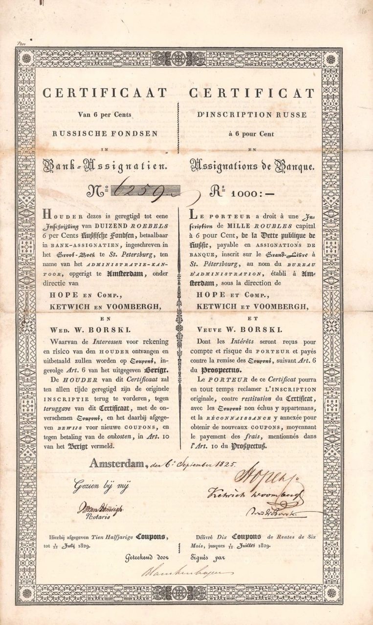 Con questo certificato, le note banche di Amsterdam hanno certificato i sottoinvestimenti nella proprietà dell’obbligazione russa al 6%, una “rendita perpetua” del 1824, registrata a loro nome nel registro del debito pubblico russo.