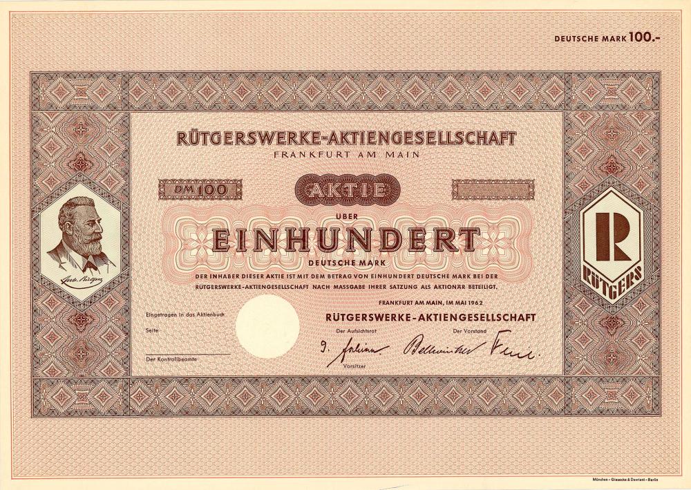 Fondata nel 1849 da Julius Rütgers come azienda che commerciava con olio di catrame come conservante del legno per traversine ferroviarie, da cui la “AG per il riciclaggio e l’impregnazione del legno” si sviluppò nel 1898, ribattezzata nel 1902 come sopra. 20 fabbriche di catrame, fabbriche di carbone artificiale e impianti di impregnazione del legno in tutto il Reich, miniera di fluorite nel distretto di Ballenstedt e fabbriche chimiche vicino a Siptenfelde, Dresda e Gleiwitz. Furono anche presi in affitto gli stabilimenti della Chemische Fabrik Weyl AG a Waldhof vicino a Mannheim e l’associazione “Silesia” delle fabbriche chimiche vicino a Saarau, Breslau e Dittersbach (la Rütgerwerke possedeva oltre il 90% delle quote di entrambe le AG). Una fusione con Deutsche Petroleum AG, prevista nel 1923, fallì a causa di ostacoli fiscali, invece vi fu un gruppo di interesse con mutua partecipazione. Nel 1947 trasferimento a Francoforte sul Meno. Nel 1995 cambio di ragione sociale in RÜTGERS AG e trasferimento a Essen nella sede del principale azionista (oltre il 98%) Ruhrkohle.