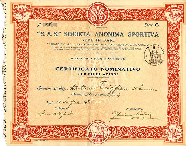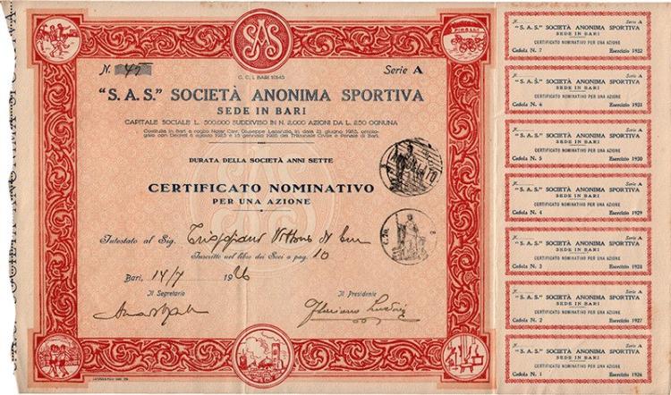 A-49319S.A.S. Società Anonima Sportiva-1Bari19261 azione nominativa di fondazione da 250 LireR3 (501-1000 pezzi)S4 (da 101 a 250 €)