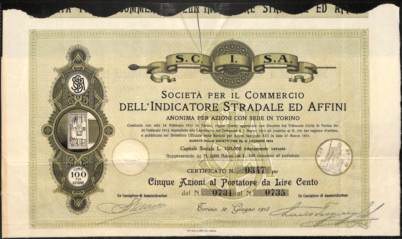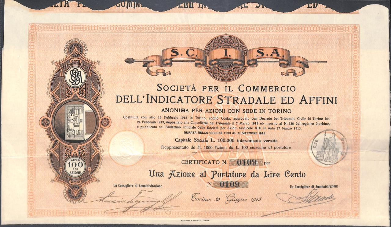 A-10915S.C.I.S.A. Soc. per il Comm. dell’Indicatore Stradale ed affini-1Officina Graf. L. Wolf & C. - TorinoTorino19131 azione--