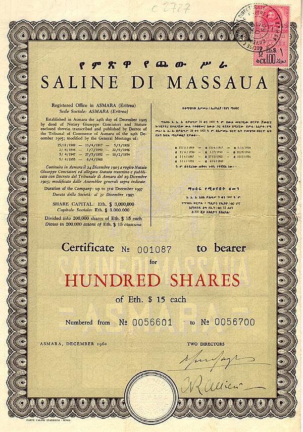 Testo in italiano, inglese ed amarico: infatti all'epoca l'Eritrea faceva parte dell'Etiopia. Massaua fu la capitale provvisoria della Colonia Eritrea, la prima del Regno d'Italia in Africa (1882-1941). Marca da bollo con il ritratto dell'Imperatore Hailé Sellasié.