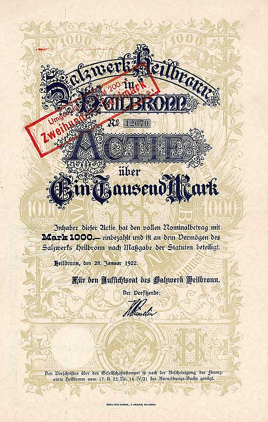 A-68062Salzwerk Heilbronn-1Heilbronn19221 azione da 1.000 Marchi--
