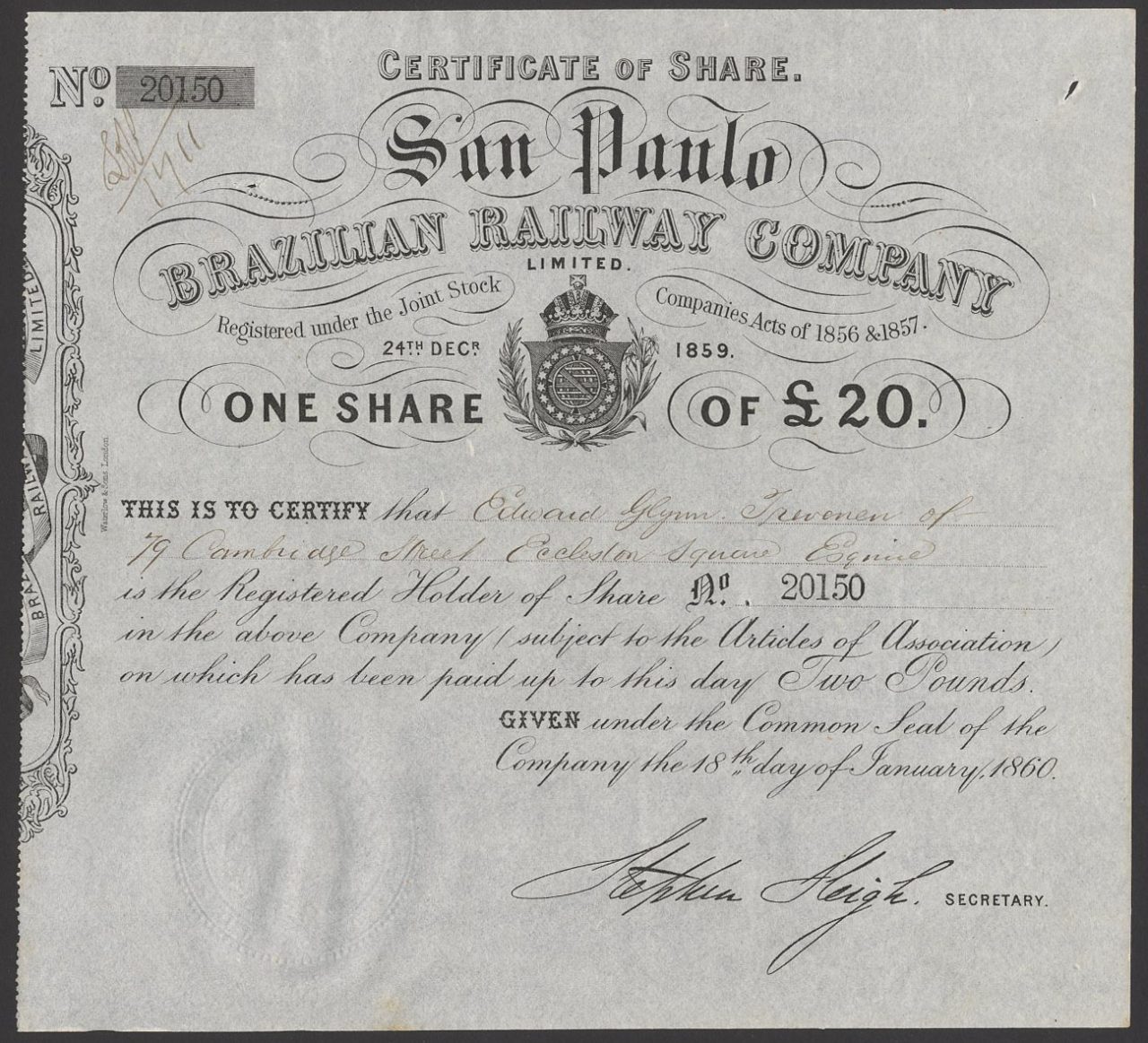 A-33720San Paulo Brazilian Railway Company Ltd.-1Brasile1860£20 ShareR2 (1001-5000 pezzi)S2 (da 26 a 50 €)