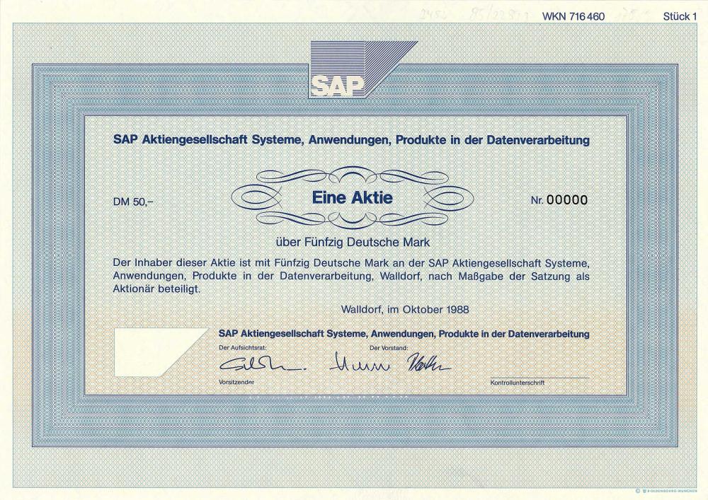 Fondata nel 1972 a Weinheim da cinque ex dipendenti IBM come "Analisi del sistema SAP e sviluppo del programma GbR". Nel 1977 trasloco a Walldorf, nel 1981 trasformazione in GmbH, dal 1988 AG. Oggi, oltre 18.000 aziende lavorano con programmi SAP in oltre 100 paesi, tra cui oltre la metà delle 500 più grandi società del mondo. SAP è il più grande produttore di software in Europa e al terzo posto in tutto il mondo. Uno dei 30 titoli DAX oggi. La più grande storia di successo di sempre tra le aziende tedesche fondate nel dopoguerra.
