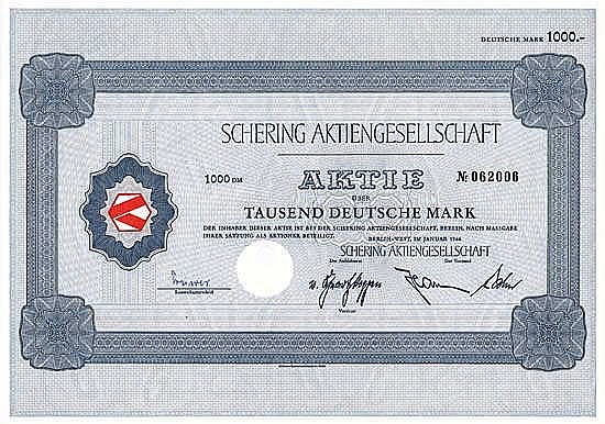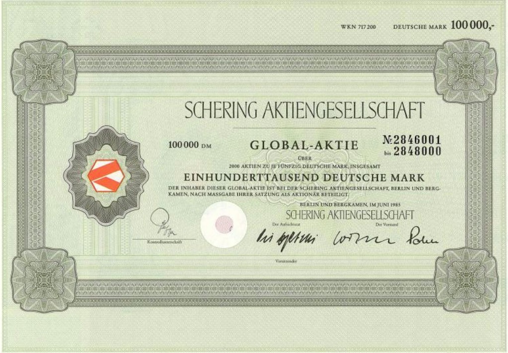 Emerse dalla “Farmacia verde” aperta da Ernst Schering nel 1851 a Chausseestrasse a Berlino. Nel 1864, Schering incorporò una fabbrica per composti di iodio e bromo puri. Nel 1871 conversione nella “Fabbrica chimica di Actien (precedentemente E. Schering)”. Negli anni ’20 Schering si espanse in particolare nel settore della carta fotografica e dei prodotti chimici fotografici e nel 1927 rilevò la più antica fabbrica di macchine fotografiche tedesca a questo proposito con Voigtländer & Sohn AG a Braunschweig. Sempre nel 1927 fusione con la C.A.F. Kahlbaum Chem. Fabrik GmbH a Berlino alla Schering-Kahlbaum AG. Nel 1937 fusione con la (Alta Slesia) Kokswerke e Chemische Fabriken AG (fondata nel 1890), che deteneva quasi il 100% delle azioni Schering, nella “nuova” Schering AG. Nel 1967 fondazione di una seconda sede a Bergkamen (Vestfalia). Fino alla fusione con Bayer AG alla fine del 2006, la società era quotata al DAX. Uno dei più importanti produttori di specialità e sostanze farmaceutiche (il più noto era “La pillola”), fitofarmaci e pesticidi, prodotti chimici industriali e molto altro. Lavora a Berlino-Wedding, Bergkamen e Wolfenbüttel.