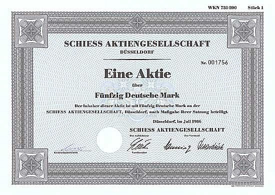 Ernst Schiess (1840-1915) di Magdeburgo ha intrapreso una carriera che è stata possibile solo nei primi tempi dell’azienda: dopo aver frequentato le università tecniche di Hannover, Karlsruhe e Zurigo, ha vissuto anni di viaggi in Germania, Belgio e Inghilterra. Come apprendista a Manchester, si rese conto che la macchina utensile, in quanto “madre di tutte le macchine”, avrebbe svolto un ruolo chiave nell’industrializzazione: voleva costruire una fabbrica per questo. L’industriale pesante Ernst Poensgen riconobbe il talento di Schiess e lo convinse a stabilirsi a Düsseldorf. Nel 1866 la “Fabbrica di macchine utensili Ernst Schiess e fonderia di ferro” era la più antica fabbrica di macchine utensili in Germania. Nel 1891 Schiess fondò l’Associazione dei costruttori tedeschi di macchine utensili VDM, di cui divenne presidente fondatore. Nel 1906 Schiess trasformò la sua azienda in una AG, co-fondatore di suo genero, il banchiere di Essen Aug. von Waldthausen. Nel 1925 fusione con l’ex Defrieswerke AG a Düsseldorf-Heerdt per formare la Schiess-Defries AG (ancora Schiess AG dal 1939). Dal 1945 al 1948 tutti e cinque gli stabilimenti furono smantellati. La ricostruzione è avvenuta su un’area molto più ampia nel distretto di Lörick. Negli anni ’50 furono fondate filiali a New York e Pittsburgh, nonché a Stamford (GB). Acquistata nel 1993 da Bremer Vulkan e ribattezzata Dörries Scharmann AG, è poi passata alla Bremer Vulkan nel 1996. In qualità di azienda successore con circa 700 dipendenti fondano la Dörries Scharmann Technologie GmbH a Mönchengladbach.