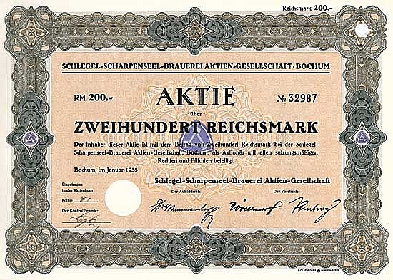 Nel 1854 Joachim Schlegel fondò il suo birrificio bavarese. Dal 1899 AG come "Schlegel-Brauerei AG", nel 1918 fusione con la "Bochumer Bierbrauerei Moritz Scharpenseel AG". Nel 1921 affiliazione della Recklinghäuser Brewery AG e della Malzfabrik Hopfenberg, Giersleben i. Nel 1922 acquisizione del birrificio Arnold Fiege, Bochum e del birrificio Ruhrtal Brinkmann, Herbede. Nel 1927 fusione con Bürgerliches Brauhaus AG, Herne. Nel 1928 acquisizione della Victoria Brewery, Bochum. Nel 1931 acquisizione della maggioranza delle azioni della Bürgerliches Brauhaus AG Duisburg. Di recente erano in funzione il birrificio Bochum con una capacità annua di 250.000 hl e il birrificio Recklinghausen (100.000 hl). Quotazione in borsa a Berlino e Düsseldorf. Nel 1971 viene ... Altro
