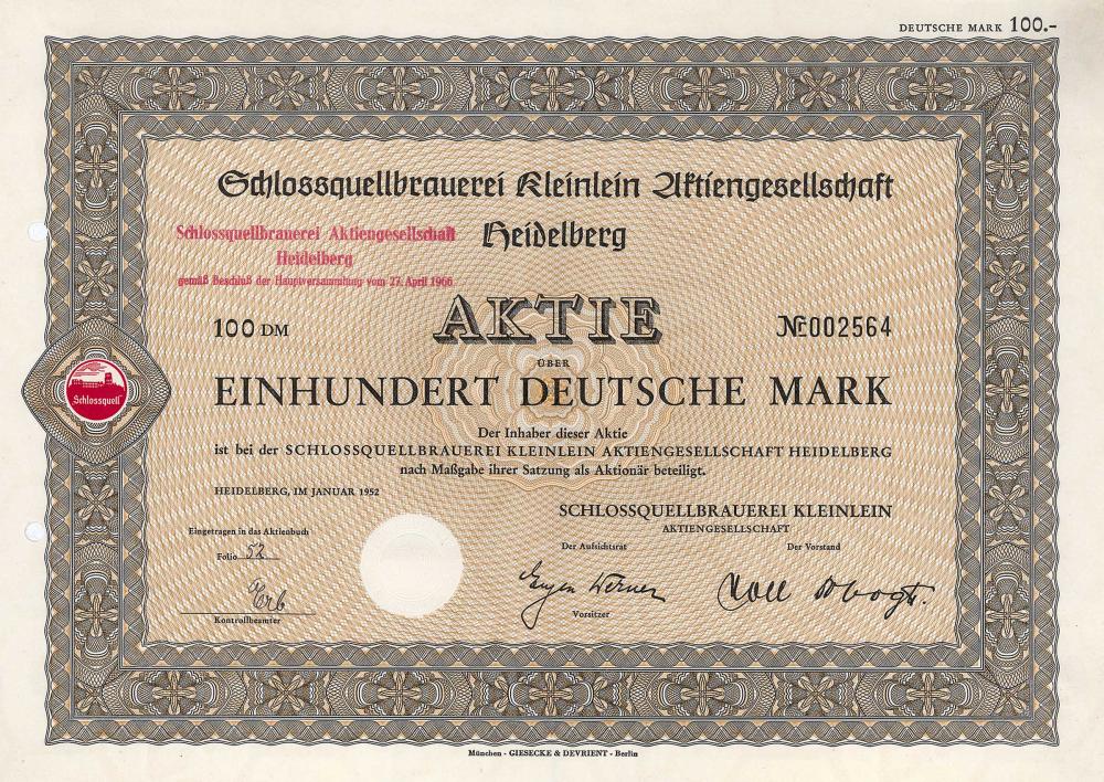 Originario del birrificio “Zum Goldenen Schaaf”, esistente dal 1753. AG dal 1884 come “Heidelberger Aktienbrauerei vorm. Kleinlein”. Nel 1916 acquisizione di Kronenbrauerei GmbH e nel 1919 di Schroedl’schen Brauerei-Ges. La società fu ribattezzata nel 1934 nel birrificio Kleinlein AG e nel 1951 nel birrificio primaverile del castello Kleinlein (l’aggiunta di Kleinlein fu abbandonata nel 1966). Quotazione di borsa: Mannheim, dal 1934 a Francoforte. Il principale azionista è stato successivamente la Schultheiss-Brauerei AG, che ha continuamente ampliato la sua partecipazione azionaria e infine integrato completamente il birrificio Schlossquell nel 1985.