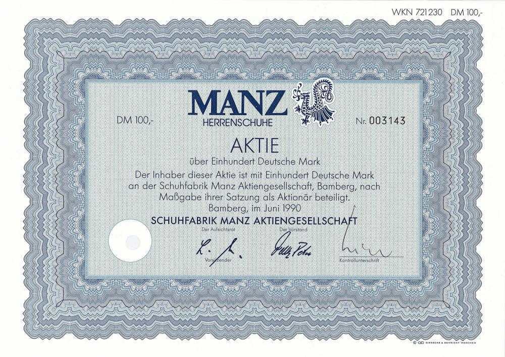 La casa madre fu fondata nel 1872 come fabbrica sotto la società S. Müller, Bamberga. Nel 1887 Heinrich e Franz Josef Manz acquisirono la società. Nel 1894 fondazione della fabbrica di scarpe meccaniche Manz & Co. Nel 1898 fusione della fabbrica di alberi e della fabbrica di scarpe meccaniche Manz & Co. nella fabbrica di scarpe e alberi meccanici Manz AG. Nel 1925 ribattezzato come sopra. La maggior parte delle azioni era di proprietà della famiglia, ma negli anni '60 la Deutsche Bank apparve con una partecipazione nella scatola. Il marchio di scarpe Mercedes è stato acquisito nel 1974 e Fortuna Shoes a Höchstadt / Aisch nel 1989. Con circa 500 dipendenti ora venivano fabbricati oltre 400.000 paia di scarpe all'anno. Trasformata in una GmbH nel 1999,... Altro