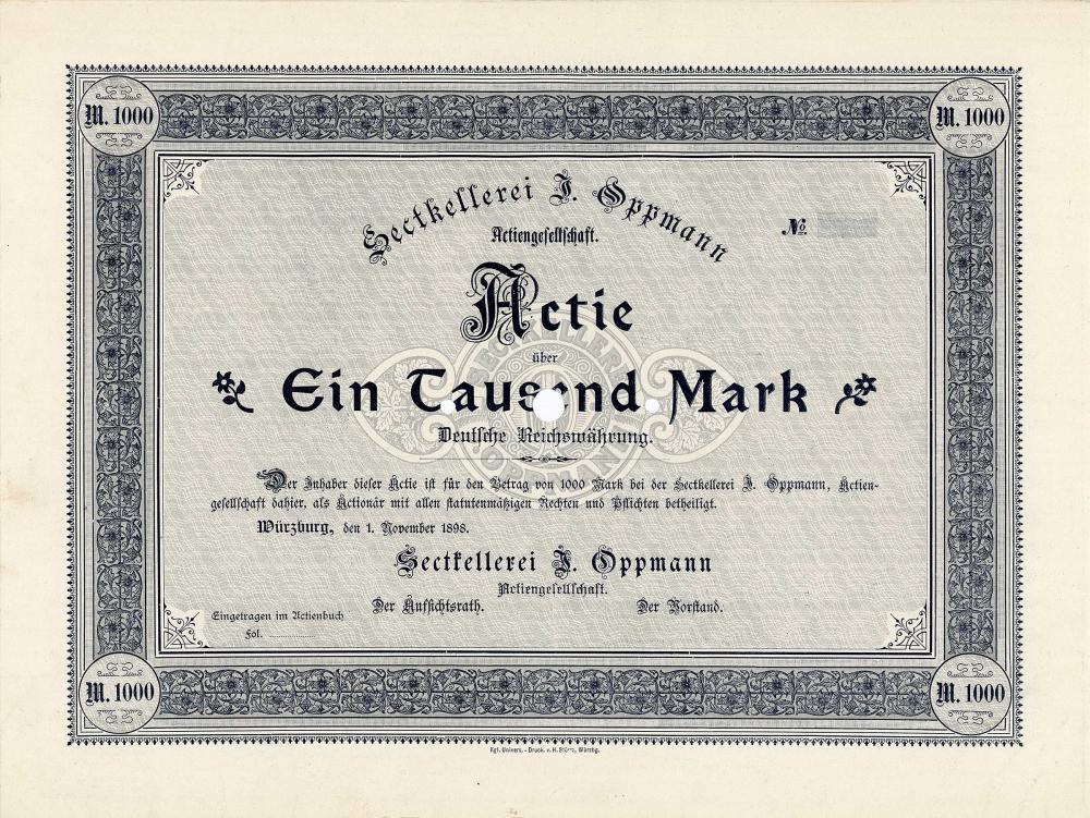 Josef Oppermann, che aveva imparato l’arte della produzione di spumante nello Champagne come figlio di una famiglia di viticoltori di lunga data a Würzburg, fondò una cantina di spumanti nella sua città natale nel 1865 all’età di 23 anni. Ci riuscì immediatamente: alla Mostra mondiale di Vienna il suo spumante ricevette una medaglia e divenne il “fornitore della corte bavarese ducale”. Ma Oppmann morì nel 1889 all’età di soli 45 anni; nello stesso anno la sua “fabbrica di spumanti” viene menzionata per la prima volta in Meyers Konversationslexikon. Con noti rappresentanti della borghesia e del commercio di Würzburg, la sua vedova convertì l’azienda in una AG nel 1898. Durante la “Notte della bomba di Würzburg” il 16 marzo 1945, le fabbriche furono in gran parte distrutte, ma le strutture sotterranee della cantina rimasero intatte, motivo per cui la produzione potrebbe essere riavviata nel 1947. L’AG, che è ancora quotata oggi, ha 24 dipendenti e produce circa 2 milioni di bottiglie all’anno. Il principale azionista è il barone August von Finck.