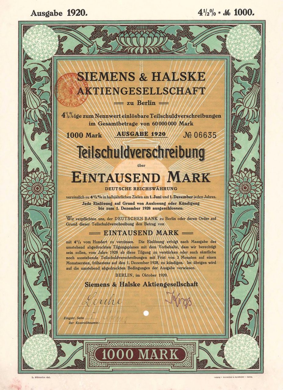 B-31497Siemens & Halske AG-2Berlino19201 obbligazione 4,5% da 1.000 MarchiR5 (101-250 pezzi)S5 (da 251 a 500 €)