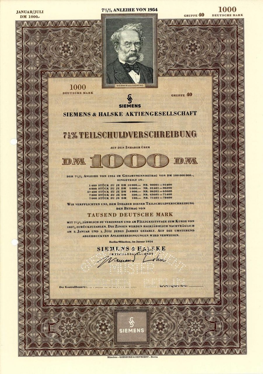 F-31497Siemens & Halske AG-6Berlino1954Obbligazione 7,5% da 1.000 MarchiR3 (501-1000 pezzi)S4 (da 101 a 250 €)