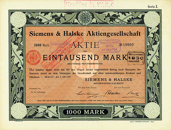 A-31497Siemens & Halske AG-1Berlino1897share for 1,000 MarksR7 (26-50 pezzi)S7 (da 1.001 a 1.500 €)