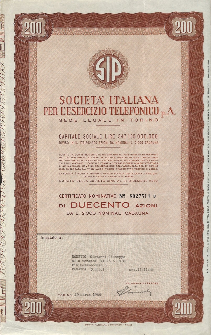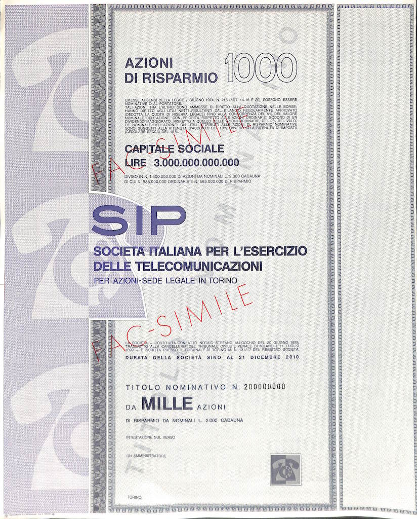 La SIP – Società Italiana per l’Esercizio Telefonico è stata una società di telecomunicazioni sorta dalla fusione di diverse società: STIPEL, TELVE, TIMO, TETI e SET; sorta nel 1899 come SIP – Società Idroelettrica Piemontese, che dopo la nazionalizzazione dell’industria elettrica (1963) si sviluppò nel settore telefonico. Al momento della sua nascita, la nuova SIP contava, su tutto il territorio nazionale, 4.220.000 abbonati, 5.530.000 apparecchi telefonici in servizio e 27.644 Posti telefonici pubblici. A fine 1993 gli utenti SIP erano oltre 24 milioni.