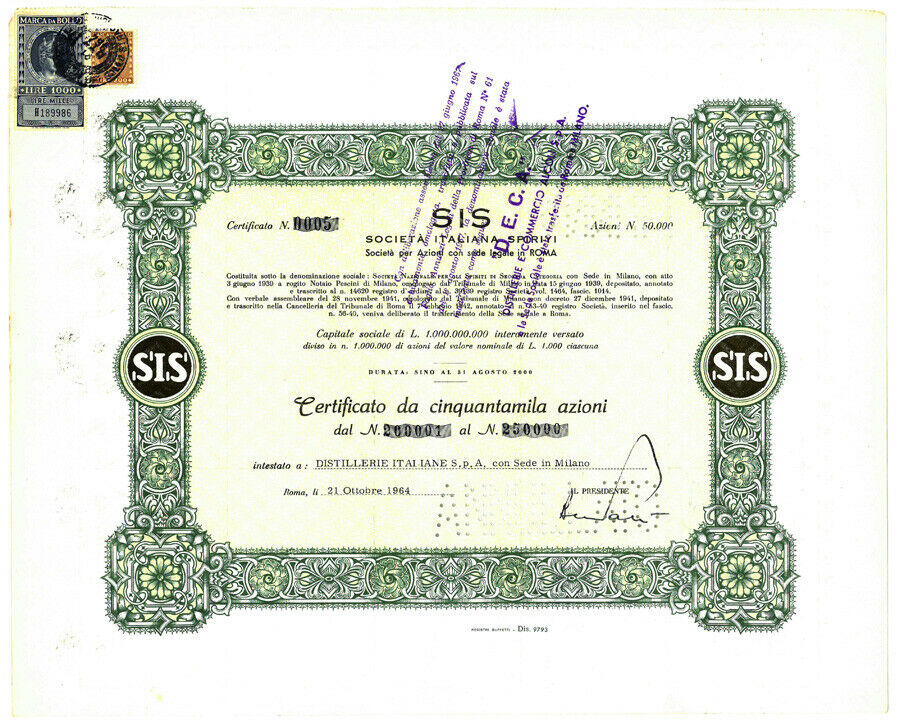 F-44408SIS Società Italiana Spiriti-6Roma196450.000 azioni nominativeR1 (Più di 5000 pezzi)S1 (da 0 a 25 €)