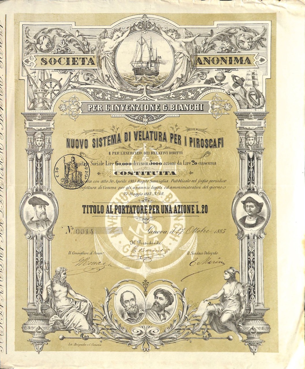 La Società Anonima per l’Invenzione G. Bianchi fu costituita con un capitale sociale di 60.000 lire, suddiviso in 3000 azioni da 20 lire ciascuna. La fondazione della società fu pubblicata nel Foglio Periodico della Prefettura di Genova il 22 maggio 1885, assicurando la sua legalità e trasparenza. La sede centrale della società era situata a Genova, un importante centro marittimo e commerciale dell’epoca.
