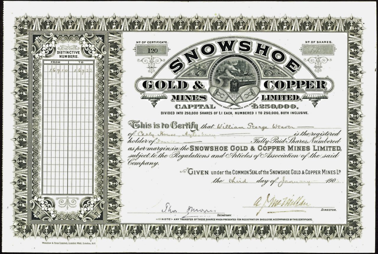 Registrato il 20 giugno 1901 per acquisire i crediti Snowshoe Mine e The Pheasant, Alma Fraction e Fairplay Fraction vicino a Phoenix, divisione Grand Forks Mining, Yale, British Columbia. Dissolto <1916. Numero società 70552