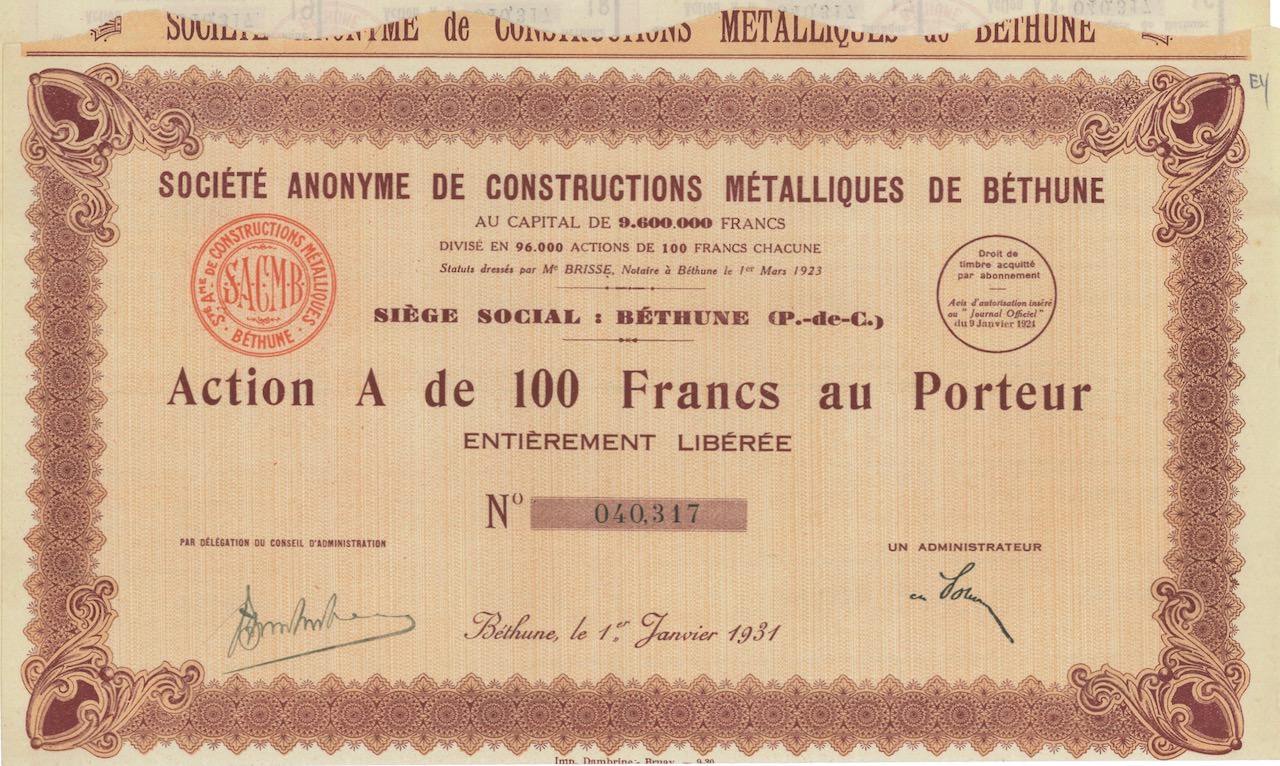 A-29000De Constructions Metalliques de Béthune soc. an.-1Béthune19311 azioneR1 (Più di 5000 pezzi)S1 (da 0 a 25 €)