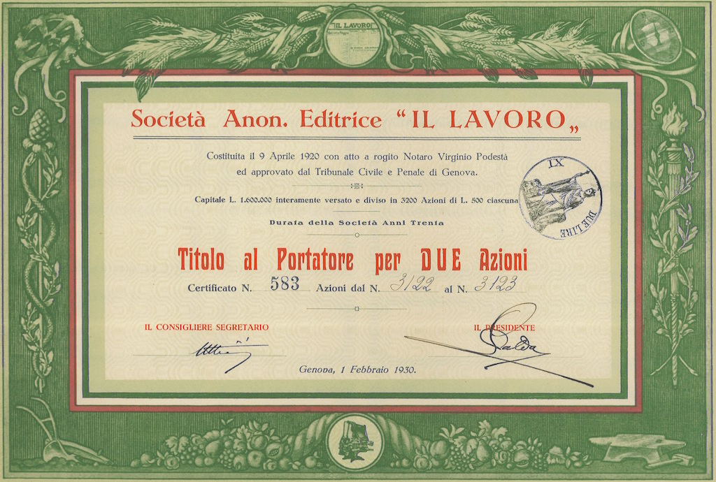A-1228Editrice Il Lavoro Soc.-1N.D.Genova19302 azioni al portatore da Lire 500R2 (1001-5000 pezzi)S3 (da 51 a 100 €)