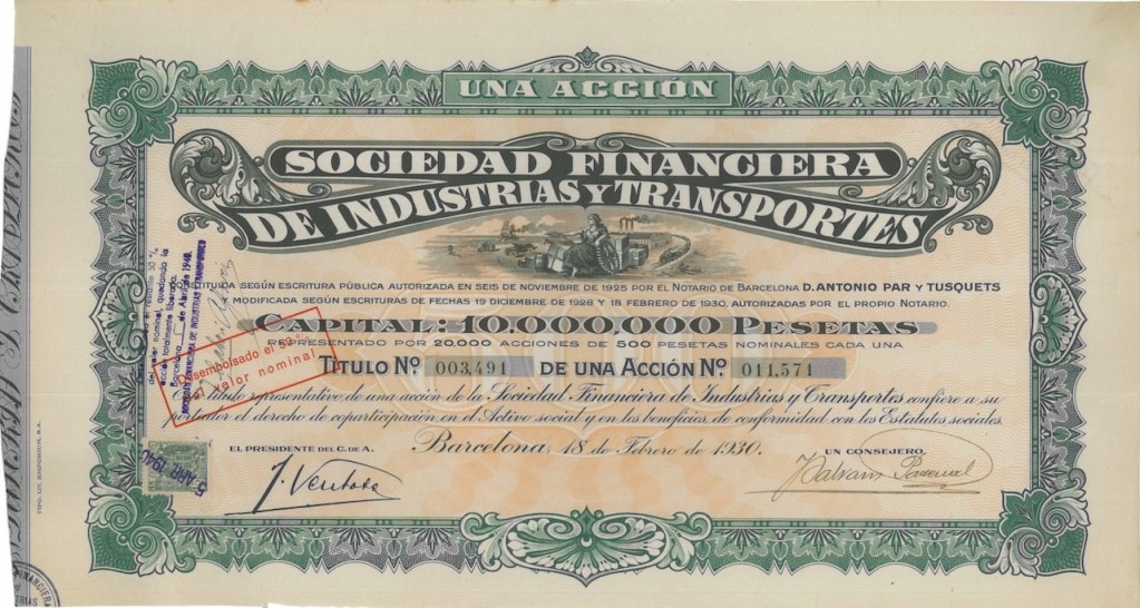 A-28170Soc. Financiera de Industrias y Transportes-1Barcellona19301 azioneR2 (1001-5000 pezzi)S2 (da 26 a 50 €)