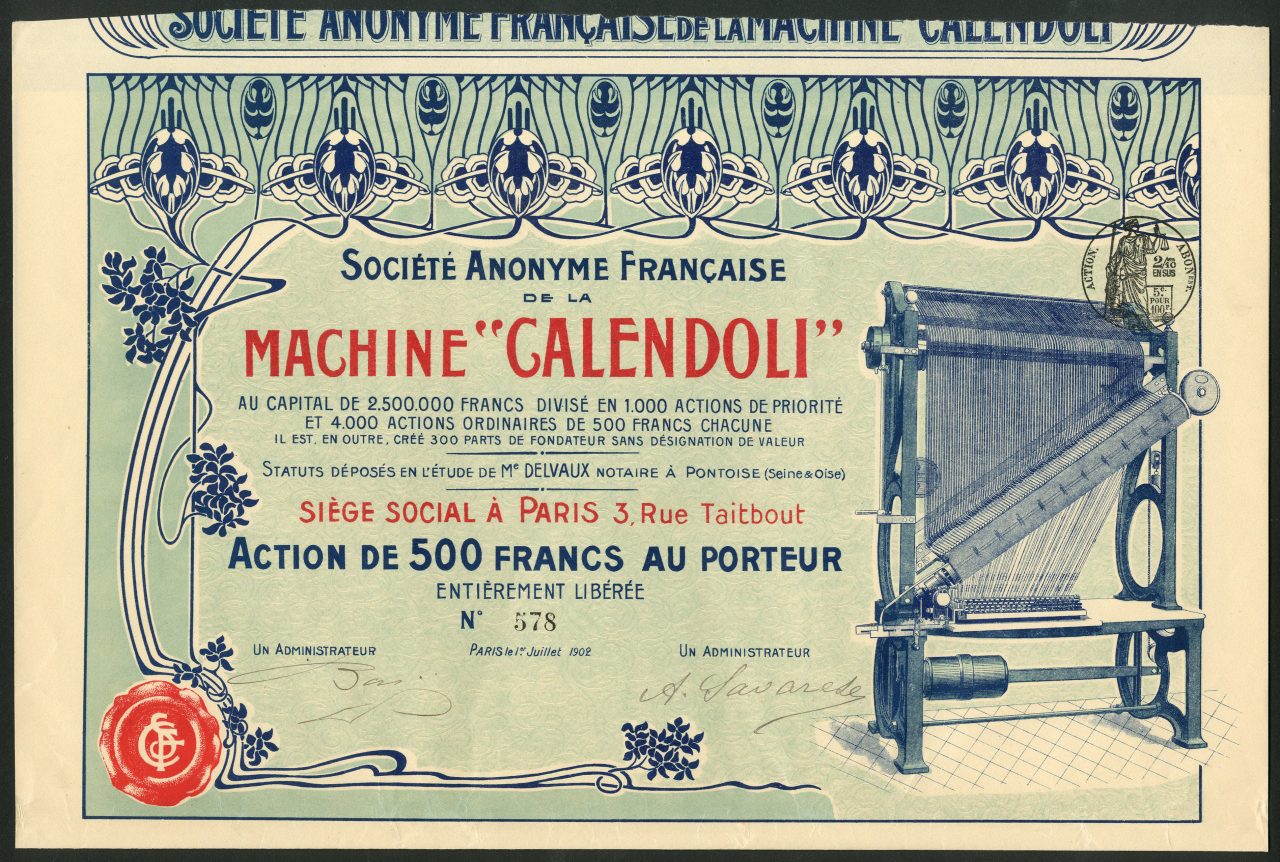 Formata a Parigi prima del 1902. Una macchina da scrivere litografica inventata da padre Calendoli, monaco domenicano, nel 1893. Capitale 2.500.000 franchi in 1000 azioni prioritarie, 4000 azioni ordinarie da 500 franchi e 300 azioni da fondatore.