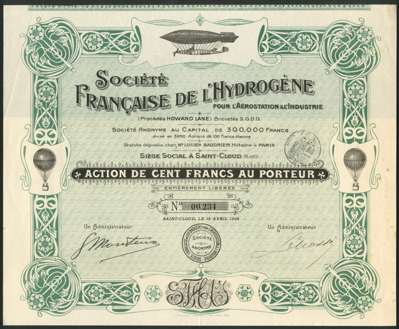 A-36225De l’Hydrogène pour l’Aérostation & l’Industrie Soc.-1Saint-Cloud19081 azione di fondazione al portatore da 100 FFR2 (1001-5000 pezzi)S3 (da 51 a 100 €)