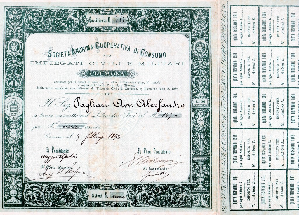 A-34274SOCIETA’ ANONIMA COOPERATIVA DI CONSUMO FRA IMPIEGATI CIVILI E MILITARI-CREMONA-1Cremona18921 Azione--