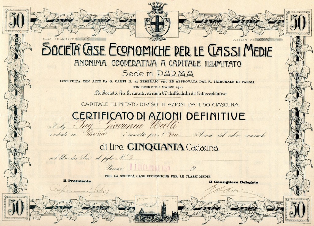 A-34093CASE ECONOMICHE PER LE CLASSI MEDIE-1Parma19201 Azione nominativa da Lire 50R2 (1001-5000 pezzi)S3 (da 51 a 100 €)