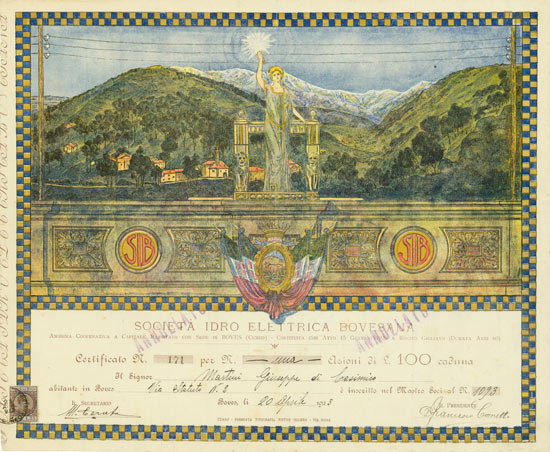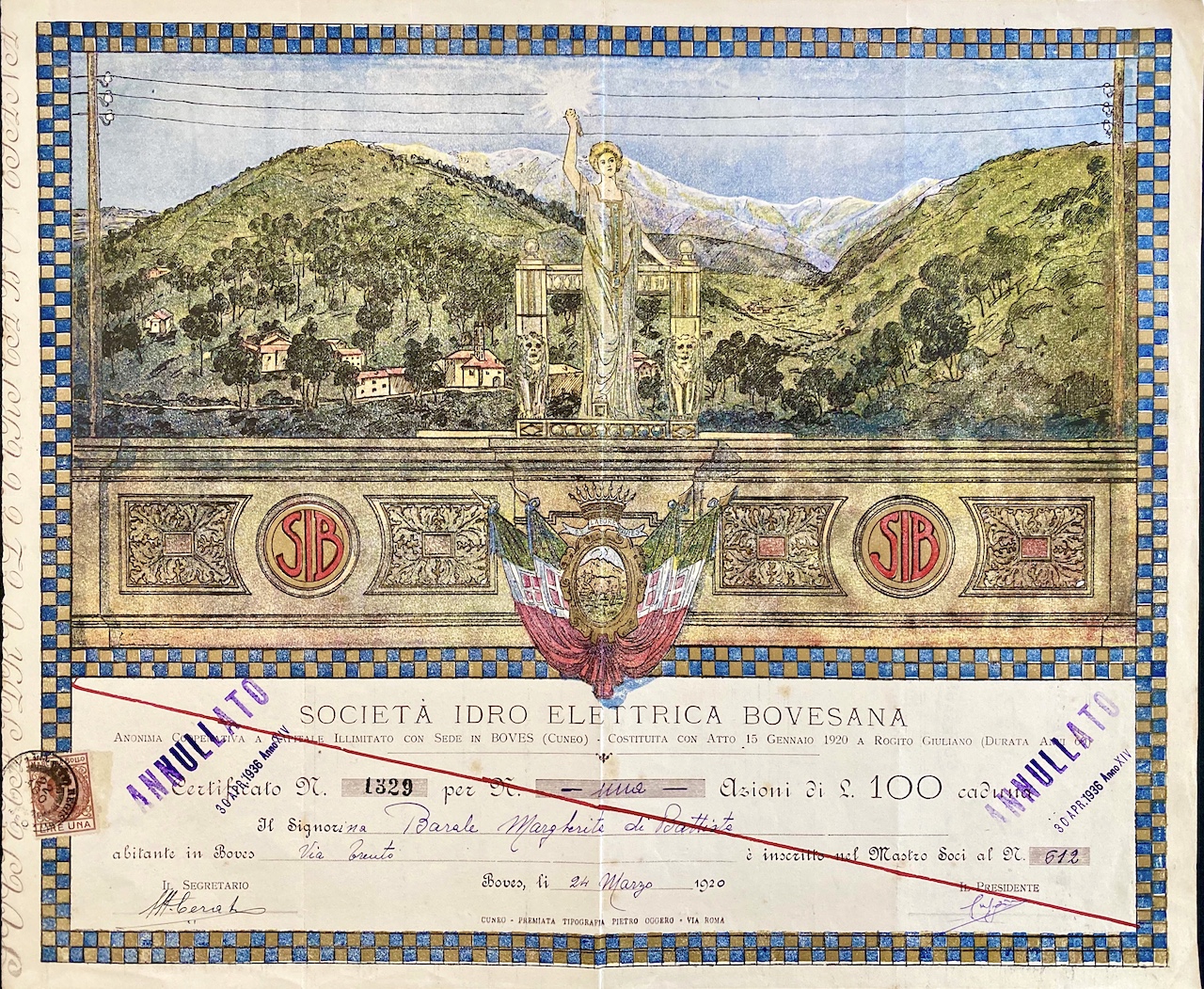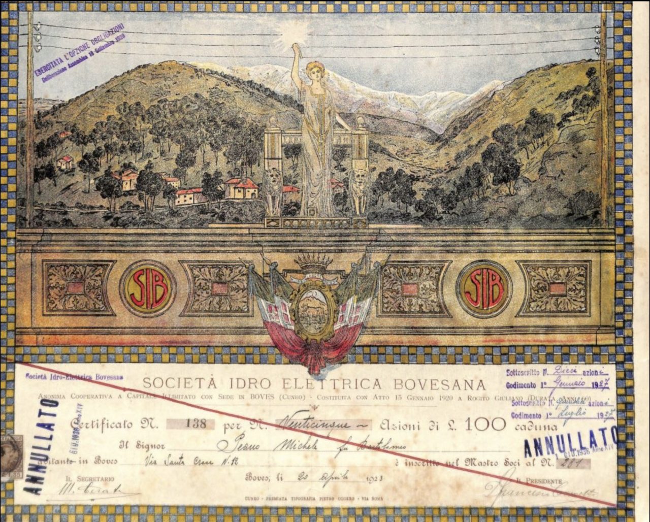 La società è stata fondata nel 1920. Gestiva una centrale elettrica nella provincia italiana del nord Cuneo. Il titolo è stato stampato dalla tipografia Premiata Pietro Oggero di Cuneo. E’ uno dei titoli più belli del panorama della scripofilia italiana. La grafica si ispira agli obiettivi sociali e riproduce un’ampia veduta panoramica del ridente centro collinare del cunese. Si può notare anche lo stemma di Boves, cimato di corona reale e fiancheggiato da vessilli.